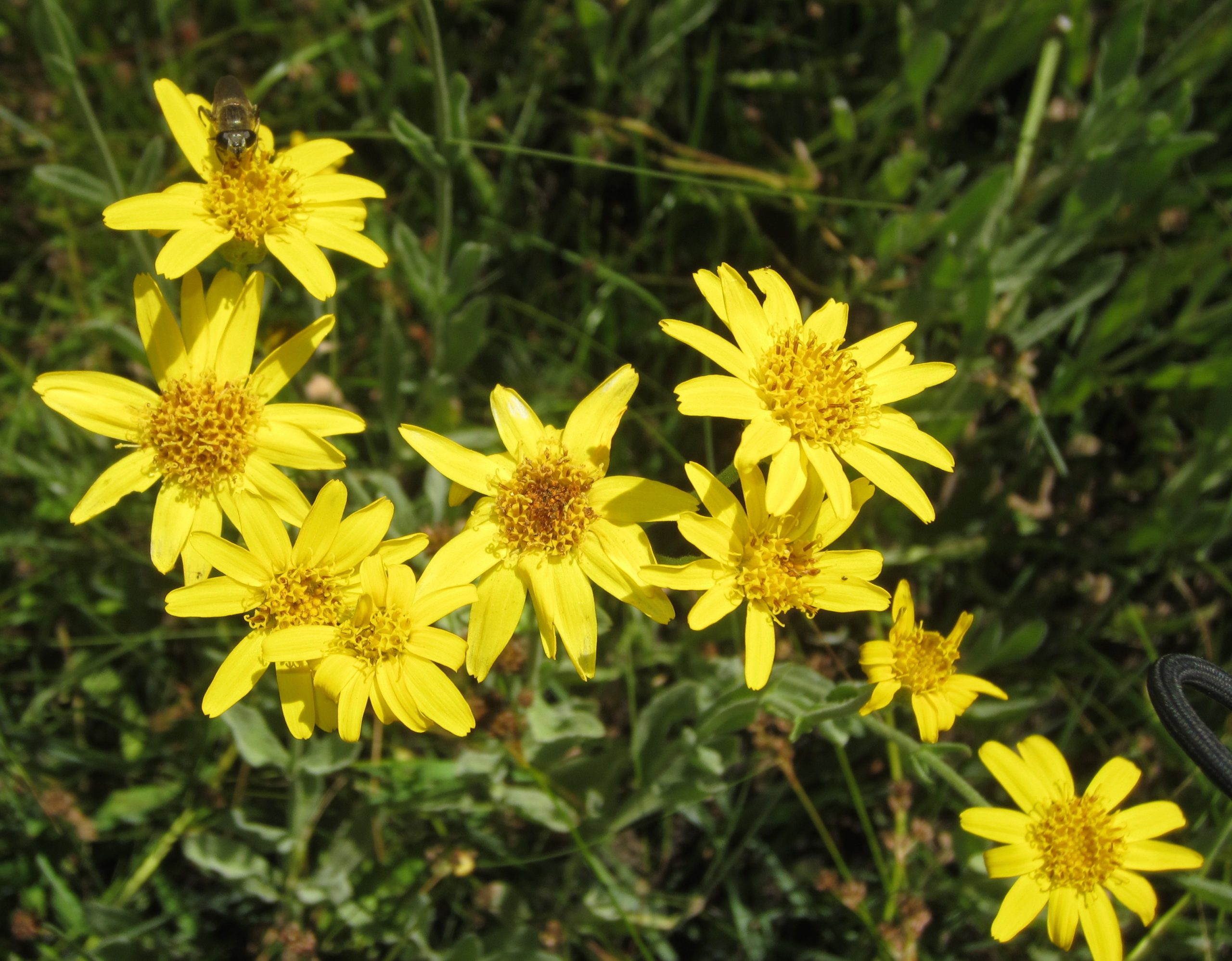 The Arnica plants were most dense within the mid-meadow where the ground was more wet, or even underwater a bit. Towards less wet ground, closer to where the meadow and the woods mingled together the Arnica plants were much more spread apart. In another section of the meadow the Arnica flowers were densely mixed with White Brodiaea flowers. Butterflies, bees, bumblebees, and other pollinators were making the rounds flower to flower; but not in abundance.