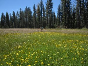 There is an isolated often visited system of small mountain meadows, surrounded by tall pines, in Lassen County that change color throughout the season as different wildflowers come to bloom, each dominating with their own separate seasonal show of color. First there is low growing early spring yellow buttercups, then Blue Camas, the white American Bistort, and other different colorful wildflower species, often occurring only in one of the associated meadows, or mixed and blooming together.