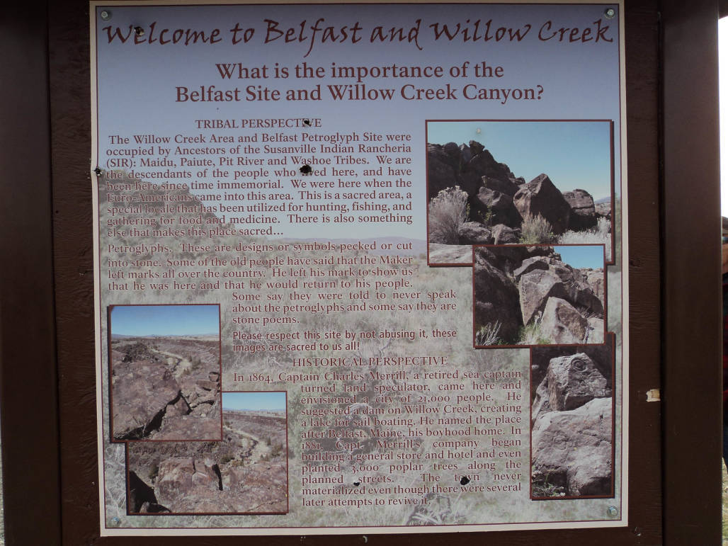 A breeze of ancient history blows across the Great Basin, whispering the story of Native Americans from thousands of years ago. These ancient peoples left their mark, carved in stone, in the form of picture petroglyphs at the Belfast and Willow Creek area between Susanville and Litchfield Ca. From Litchfield, turn West on Center and travel about four miles and turn North on Belfast Road. Belfast Road is a gravel road and is maintained only to a certain point during the winter months. The petroglyph parking area is about four miles from the pavement. Just after the one lane bridge that crosses Willow Creek there is a deceptive “No Trespassing” sign. This sign pertains to the private land that borders Belfast Road but NOT to the road itself. Easement has been granted by the property owner to access the petroglyph site, so drive on by that sign and you will soon find the turn out and kiosk announcing the site. A visible trail leads to the large pile of lava rock that houses the ancient markings. Further down the trail you will find some great fishing, hunting and hiking ground along Willow Creek. Take a trip back in time, visit Belfast Petroglyphs and see what the ancestors of the Maidu, Paiute and Pit River tribes left behind.
