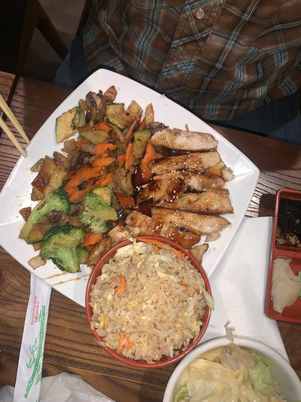 Excited to see so many other options on the menu in addition to sushi, I landed on Hibachi New York Steak. There were several Hibachi meals offered and each included their house-made onion soup, house salad with Miso dressing, grilled veggies topped with two tasty grilled shrimp and a bowl of rice. A thin steak was good-sized and the lightly seasoned fresh beef was grilled perfectly for very good flavor.