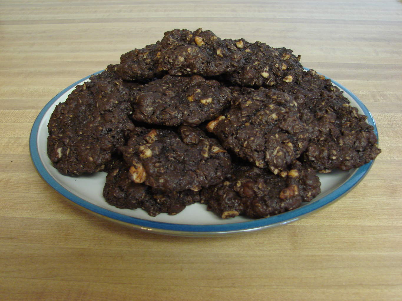 1 cup (6 oz.) chocolate chips (I use Hershey’s Special Dark) Combine flour, cocoa, baking soda and salt…set aside. In a large bowl beat butter, coconut oil and sugar until light and creamy, scraping sides often. Add egg and mix well. Blend in water and vanilla. Add combined dry ingredients and mix until blended. Stir in oatmeal, chocolate chips and nuts. Drop by rounded tablespoonfuls onto cookie sheet lined with parchment paper. Bake in preheated 350 ° oven for 12 minutes, or until almost no indentation remains when touched.