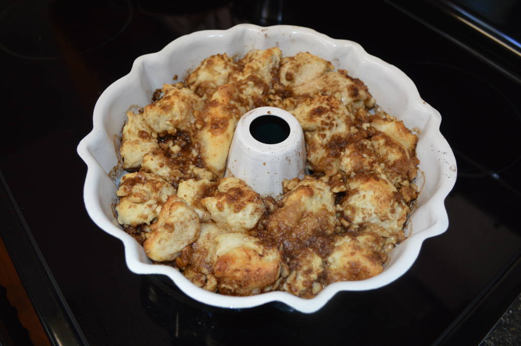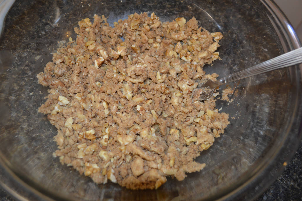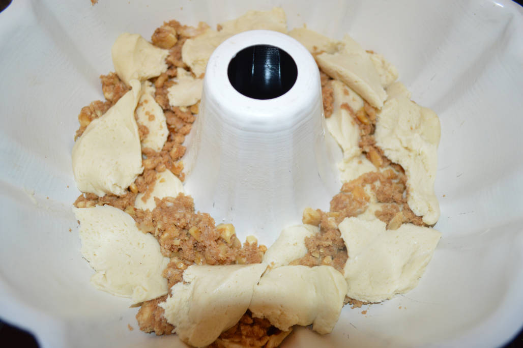Mix sugar, flour, cinnamon and butter with pastry cutter or using two knives. Cut until crumbly, in small crumbles: Place about 1/4 cup of the crumbly mixture in the bottom of the well-buttered pan. Begin dropping clumps of dough over the mixture. Add more mixture over the dough and repeat, adding more dough and crumbles until you have used them all: Bake at 375ยบ for 25 minutes. Cool 5 minutes. Loosen edges with knife before removing from pan.