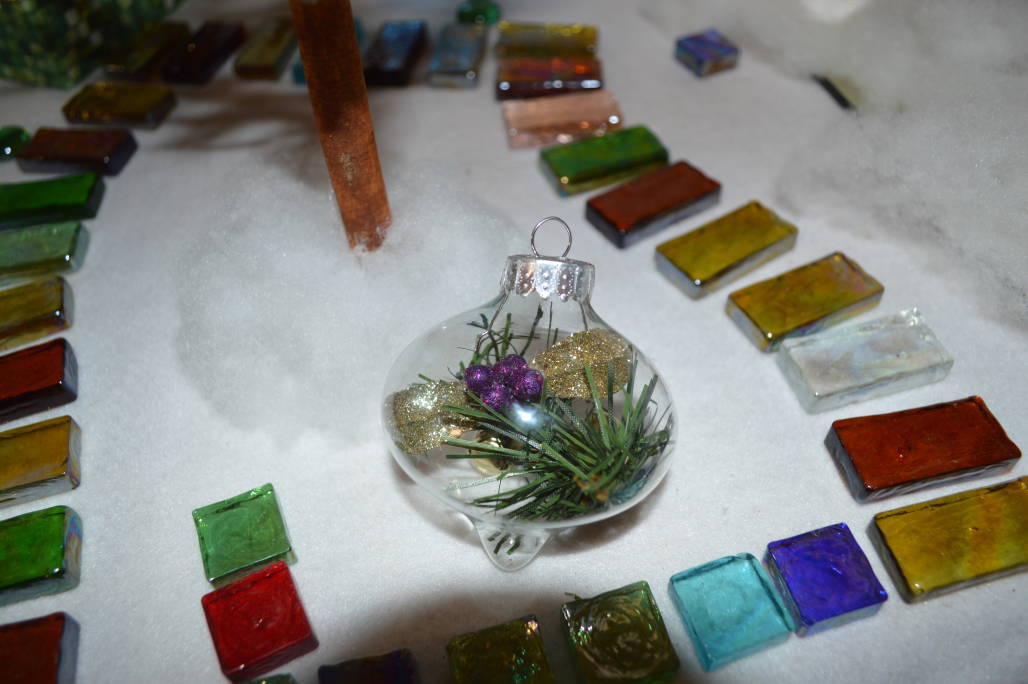Easy Holiday Ornaments Kids love to help make these! Buy some fillable, clear glass ornaments. Lay out some faux greenery, glittery leaves, beads, and other tiny ornaments. We glued the clump of purple foam berries between two leaves before poking it in. Place greenery first and use a pencil to push things around where you want them.