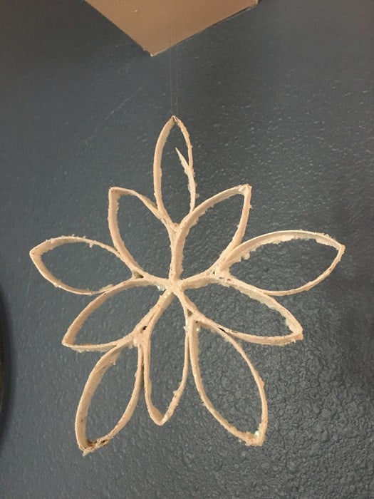 By Ashlee Herrera You need toilet paper roll, hot glue, white paint, sparkles or glitter and ribbon or fishing line. Cut the toilet paper roll into ¼ inch strips. I let the boys make their own pattern. Use your imagination. Lay out your design before you glue.