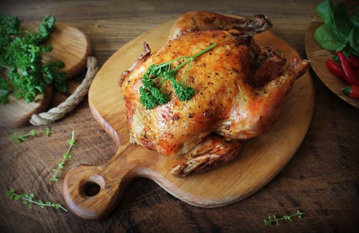 Rub on butter then salt and pepper turkey. Cover loosely with foil so it doesn’t stick to the skin, but tightly around the pan to seal in juices.Roast at 325º for 20 minutes per pound or until leg meat falls from the bone when pulled on. Remove foil last half hour in order to brown the turkey.