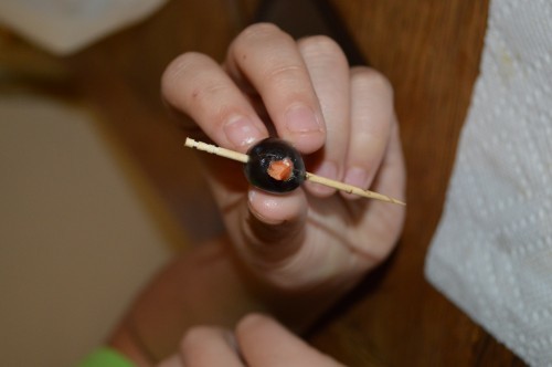 (Note: These are not super fast or easy, but they sure are cute! You may want to make just a dozen or so to stand guard over the relish tray. Our kids had fun making them.)