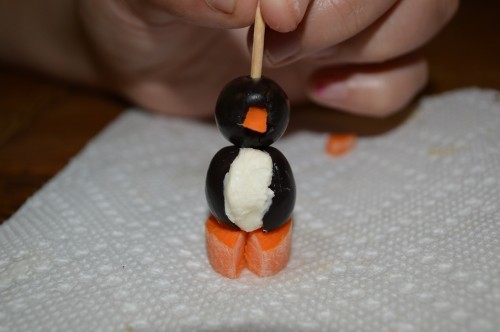 Cut one slice of carrot about 1/2 inch thick for the base (feet); cut out one tiny triangle from the carrot slice. It will become the beak. Poke it into the back end of an olive (pointed side out), to make the beak, using a bit of cream cheese if needed to make it stay. Make a little ball of cream cheese about half the size of an olive. Slice open one side of a second olive and insert the ball of cream cheese for the belly. Smooth out the cream cheese with a knife for a white, round belly. Poke the toothpick into the top of the head and into the top of the olive filled with cream cheese. Make sureĀ  the belly and beak point the same direction. Now poke the toothpick with body and head into the carrot with cutout in the front. This will be the feet. Cut a thin slice of carrot and cut out a bow tie shape with a knife. Adhere ‘bow tie” to the cream cheese at your penguin’s neckline.