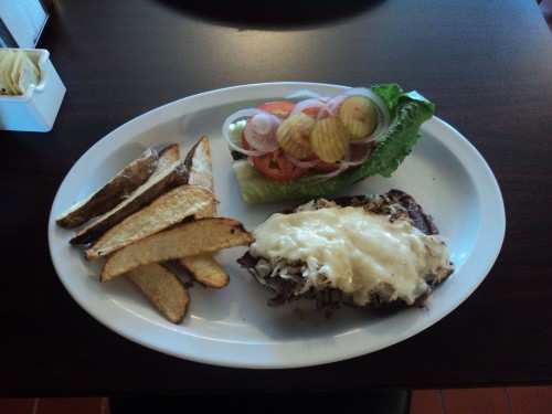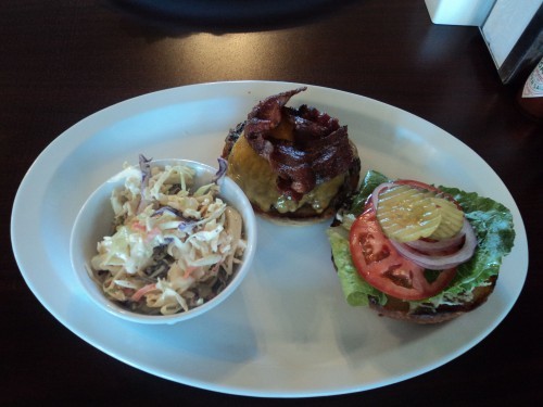 My husband Randy is a big fan of the classic Rueben Sandwich and when he learned that the corned beef is home made on sight, he was sold. Served on soft, fresh baked, homemade dark rye with a pile of wedge cut steak fries; it was a huge meal fit for a king. The sauerkraut was tangy but still mild and the dressing was in perfect proportion, not skimpy or sloppy. I can’t believe he ate the whole thing! I don’t often order much red meat but the burgers at JJ’s Cafe are made from fresh, grass fed, local, Black Angus Beef from Hat Creek Grown LLC, just a few miles down the road. Might as well go all way and top it off with thick, crispy bacon and a wedge of melting cheddar cheese. That was a sinful choice for me so I ordered the coleslaw and sacrificed the fries. Good girl; right? My burger was delicious, more like a quality ground steak, juicy and perfectly spiced, served on a light, perfectly toasted, fresh baked bun. (No store bought breads at JJ’s Cafe!)