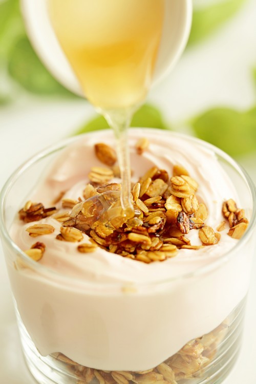 Put yogurt in a pretty bowl. Top with granola and nuts. Drizzle honey on top. Serve with hot tea sweetened with honey.