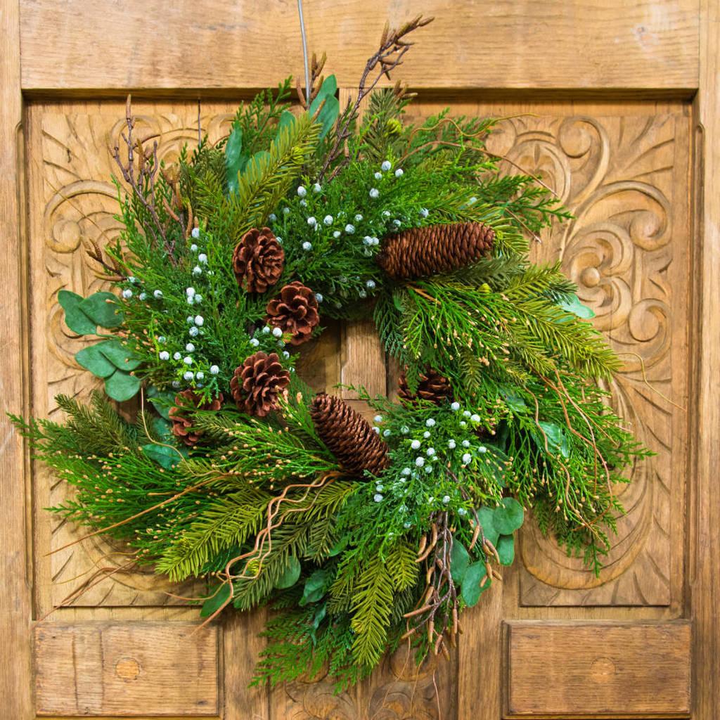 pine cones • silk flowers • fresh flowers (red and white carnations look great and last well – especially when capped individually with ends filled with water, available at a floral supply. Otherwise, choose silk or remove flowers as they wilt.) • fresh herbs like rosemary • mini ornaments • artificial berry clusters • baby’s breath •