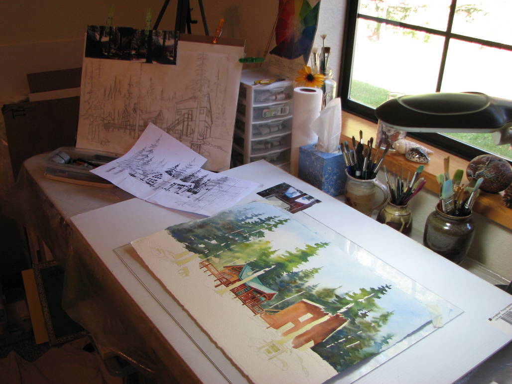 Sylvia also does commissions of local homes, gardens and other special features. She begins by taking many photos and then does a mock-up of the picture on vellum finding a focal point of interest that determines her drawing. Next she sketches it with the light and dark contrasts and finally paints the finished product on 300lb watercolor paper.