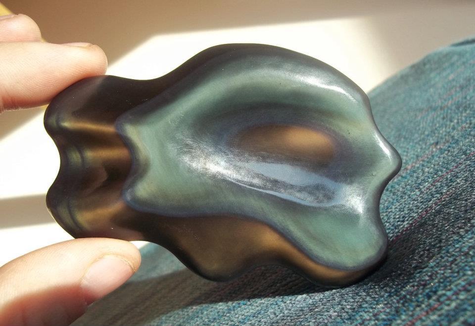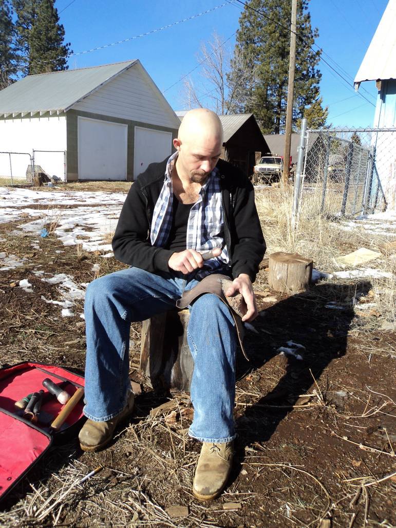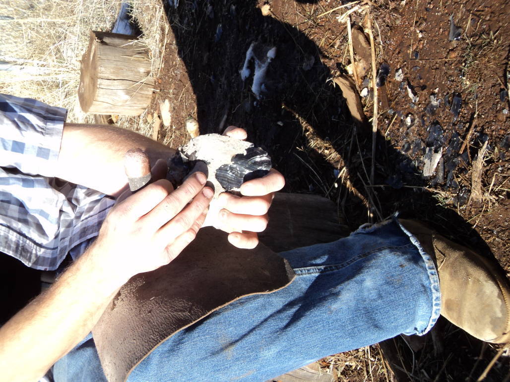 Westwood local Jeremy Mayes has been knapping obsidian for the last few years and was kind enough to offer me a fascinating demonstration. Opening his very minimal tool kit , Jeremy first placed a thick piece of leather over his thigh to protect himself from cuts and slivers. He then began knocking small pieces off his chosen chunk of the gorgeous rainbow obsidian with a copper topped, rounded wooden tool he called a bopper. As he tapped, Mayes explained that shaping this rare and beautiful glass of the earth depends solely on the angle and force of each strike made by the knapper. It takes hours practice of master the finesse of exactly where and how hard to strike your project next to whittle your way to the desired shape and texture.