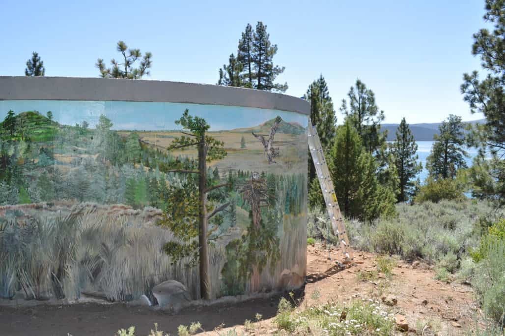 Susanville, CA – Nearly a month after its closure, the Eagle Lake Ranger District on the Lassen National Forest has re-opened the Osprey Overlook Trail to visitors. The area had been closed to ensure the safety of both the public and the contractor during restoration of the water tank mural. Scaffolding platforms had been in place that enabled local artist Janet Fraser Dickman to reach the tank and complete the restoration of the ten-year-old mural. Additionally, because the paint Fraser Dickman used dries quickly, it was imperative that she not be interrupted during the work.