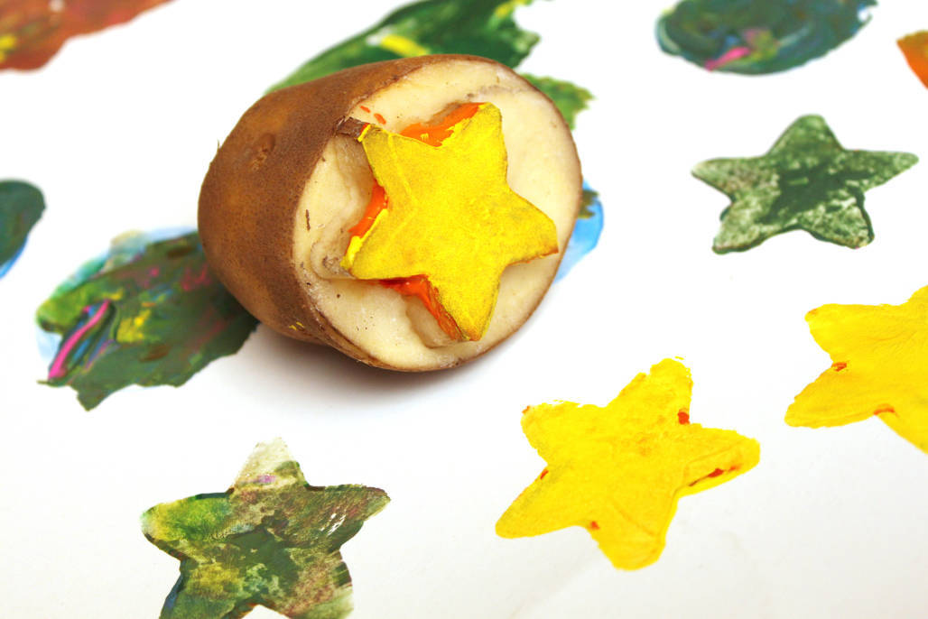 Prepare chosen food–halve or slice. Gently pat juicy foods, such as a pear or orange, with a paper towel to dry off surface. Lightly press food into paint of desired color, careful not to get paint on sides. Transfer food, paint side down, onto paper. Experiment with pressure, angles, number of stamps to create different effects. Let paint dry completely before handling. Depending on card’s purpose, you may write a personal message or salutation, or you may leave it blank and write on the opposite side.