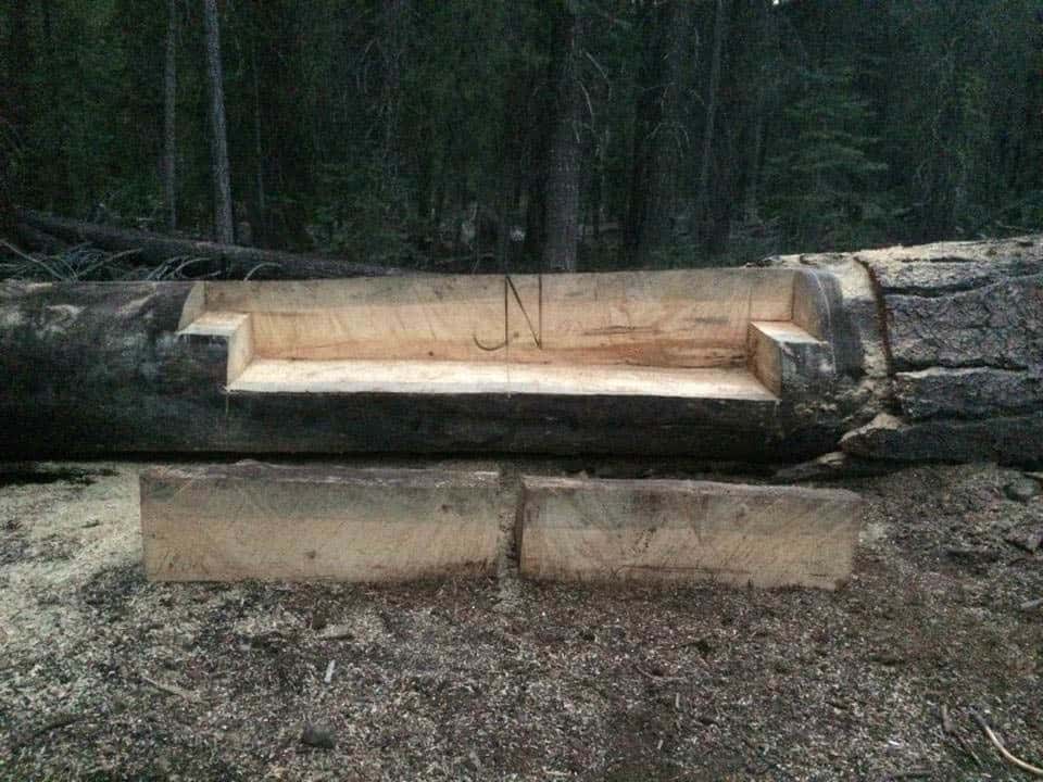 Living in the mountains has its perks, stumbling upon random couches built out of a tree in the middle of the forest happens to be one of them thanks to John and Mary Lewis, the creative minds behind the ice cave couch. Mary who has been visiting the area to spend time with her grandma since she was a little girl has been creating fond memories vacationing and exploring for the past 39 years. She says they originally got the idea from the much loved website Pinterest. Come to find out this is the second couch they’ve built. Their first log couch sits around one of their favorite campsites at Domingo Springs as their very first and very successful experiment. John used the only tool he had available to him which was Mary’s grandfathers 1978 saw with a 20 inch blade. The tree had only recently fallen and Mary described the saw dust as wet and said that you could literally wring it out! This combined with the saw made the project fairly long for John but the end results were more than worth it. John dedicates his hard work to his mother, Nancy Mueller and even puts her cattle brand stamp on the side of the carved out tree.