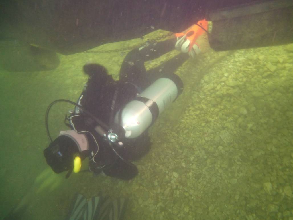Whiskeytown Lake gets pretty dark after about 45 feet down. There is also a very significant thermocline at around 12 to 28 feet deep depending on the time of year and ambient temperature. This means that temperatures drop 8 to 10 degrees in the space of 1-2 feet. It is a definite line that you can feel and even see at night with lights. It’s where the warm, less dense water sits on top of the colder, more dense water creating a very defined temperature line. It also has a bit of a fuzzy optical effect and at night it shows up as a reflective layer that partially bounces the light back.”