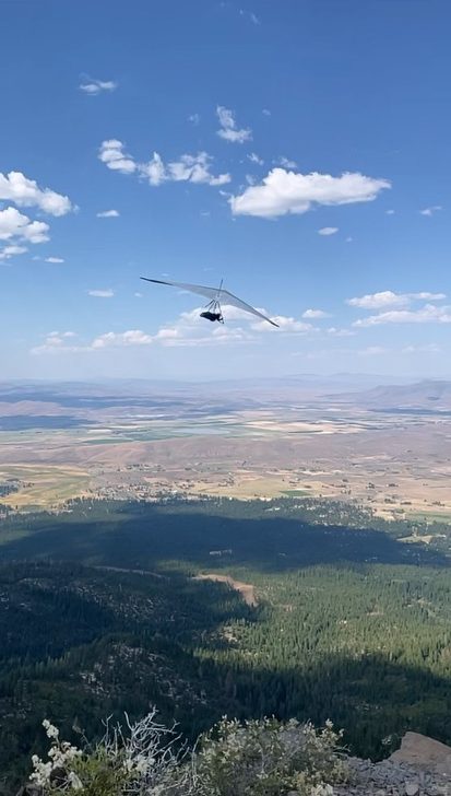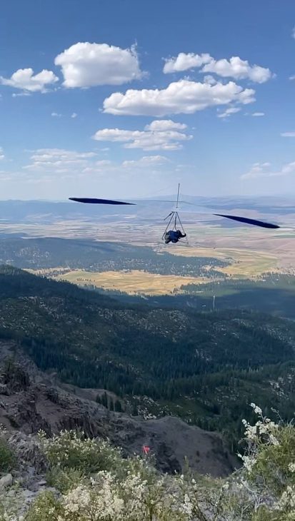 Quam notes that people envision jumping off a cliff when they hang glide, but in many cases like at Hat Creek the terrain is more of a gradual slope that pilots would run down before taking to the air. “It’s also predominately paragliders who utilize that site nowadays,” he adds.